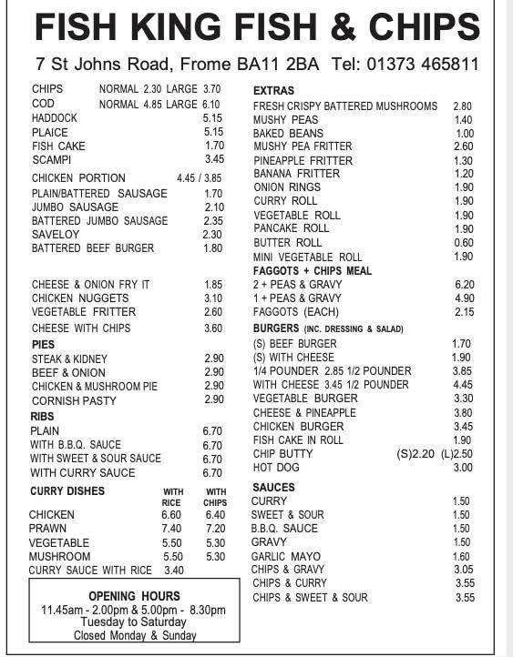 Fish King stands out in the local food scene of Frome, a charming market town in Somerset. Nestled on St John's Road, this chippy is easily accessible, with ample free street parking and wheelchair-friendly facilities, making it a convenient stop for anyone craving a hearty meal. Frome is known for its vibrant arts community and rich heritage, and Fish King embodies the spirit of the town with its commitment to quality and customer service. Open daily, the establishment enjoys a steady flow of patrons throughout lunch and dinner hours, and the warm, casual atmosphere encourages a community feel. The staff here are known for their friendly demeanor, often engaging in light-hearted banter with regulars, which elevates the dining experience. The takeaway service is popular among locals who appreciate the quick service alongside a top-notch menu. Reservations are also welcomed, particularly during busy weekend evenings, ensuring that you always have a spot to enjoy your meal. Whether you’re grabbing a quick bite or sitting down to savor your food, Fish King provides a welcoming and enjoyable experience.